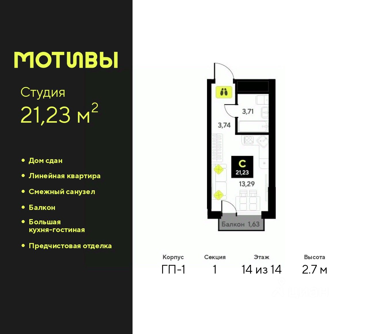 Продается 1-комн. квартира-студия от застройщика с предчистовой отделкой в ЖК "Мотивы" на 14 этаже. Общая площадь: 21.23 кв.м., площадь гостиной 13.29 кв.м., из которых 5 кв.м. выделено под кухонную зону. Все окна выходят на одну сторону. В квартире один балкон, один совмещенный санузел. Высота потолков 2.7 м.