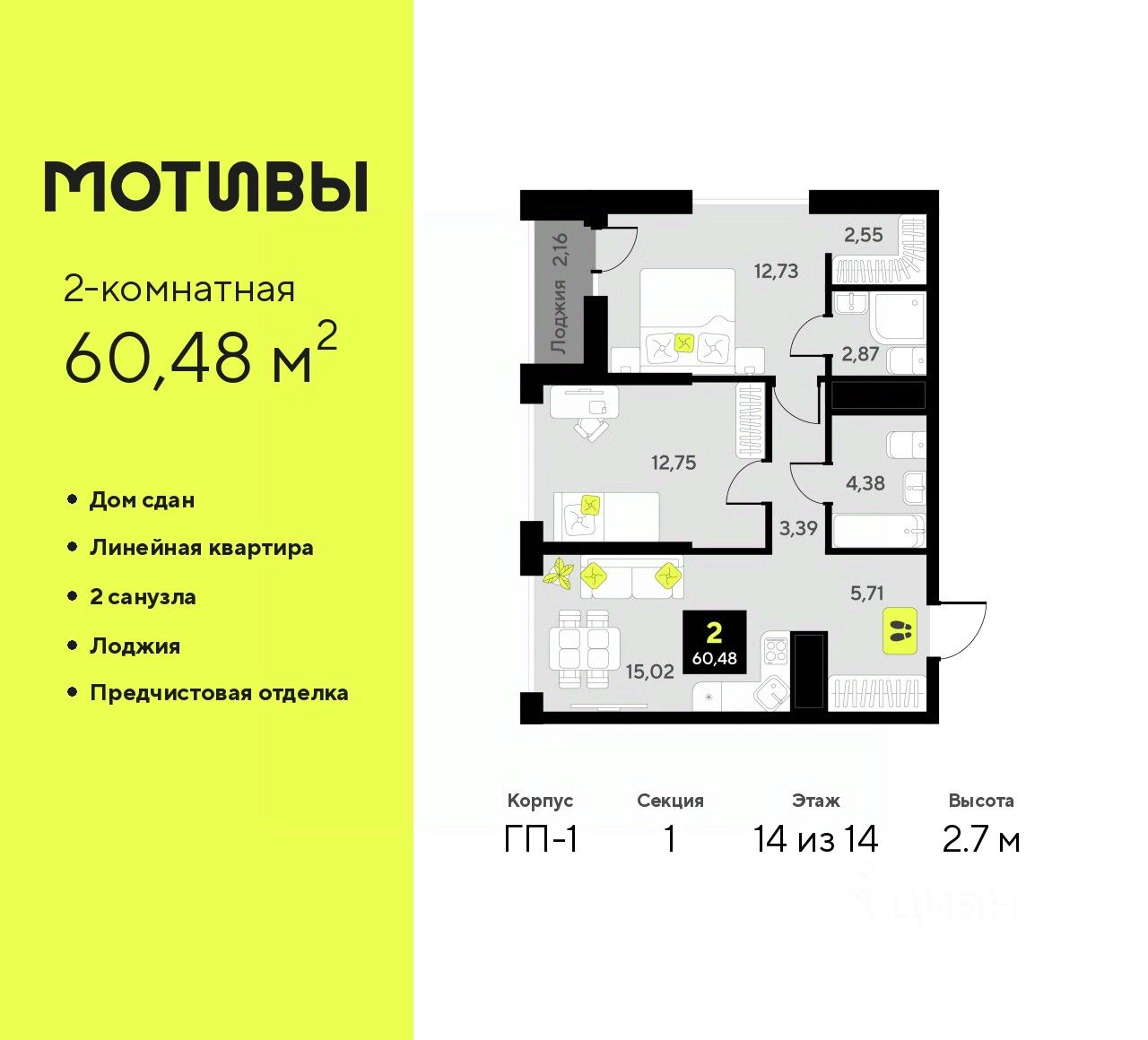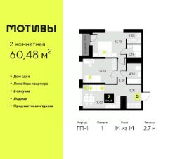 Продается 2-комн. квартира с предчистовой отделкой в ЖК "Мотивы" на 14 этаже. Общая площадь: 60.48 кв.м., жилая: 25.48 кв.м., площадь просторной кухни-столовой: 15.02 кв.м. Комнаты изолированные, все окна выходят на одну сторону. В квартире одна лоджия, два совмещенных санузла. Высота потолков 2.7 м.
