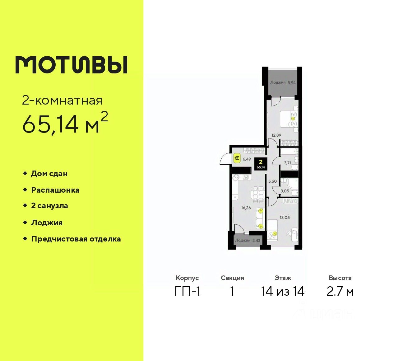 2-комн. квартира от застройщика с предчистовой отделкой в ЖК "Мотивы" на 14 этаже. Общая площадь: 65.14 кв.м., жилая: 25.94 кв.м., площадь просторной кухни-столовой: 16.26 кв.м. Квартира - распашонка, без проходных комнат, окна выходят на paзные стороны дома. В квартире две лоджии, два совмещенных санузла. Высота потолков 2.7 м.