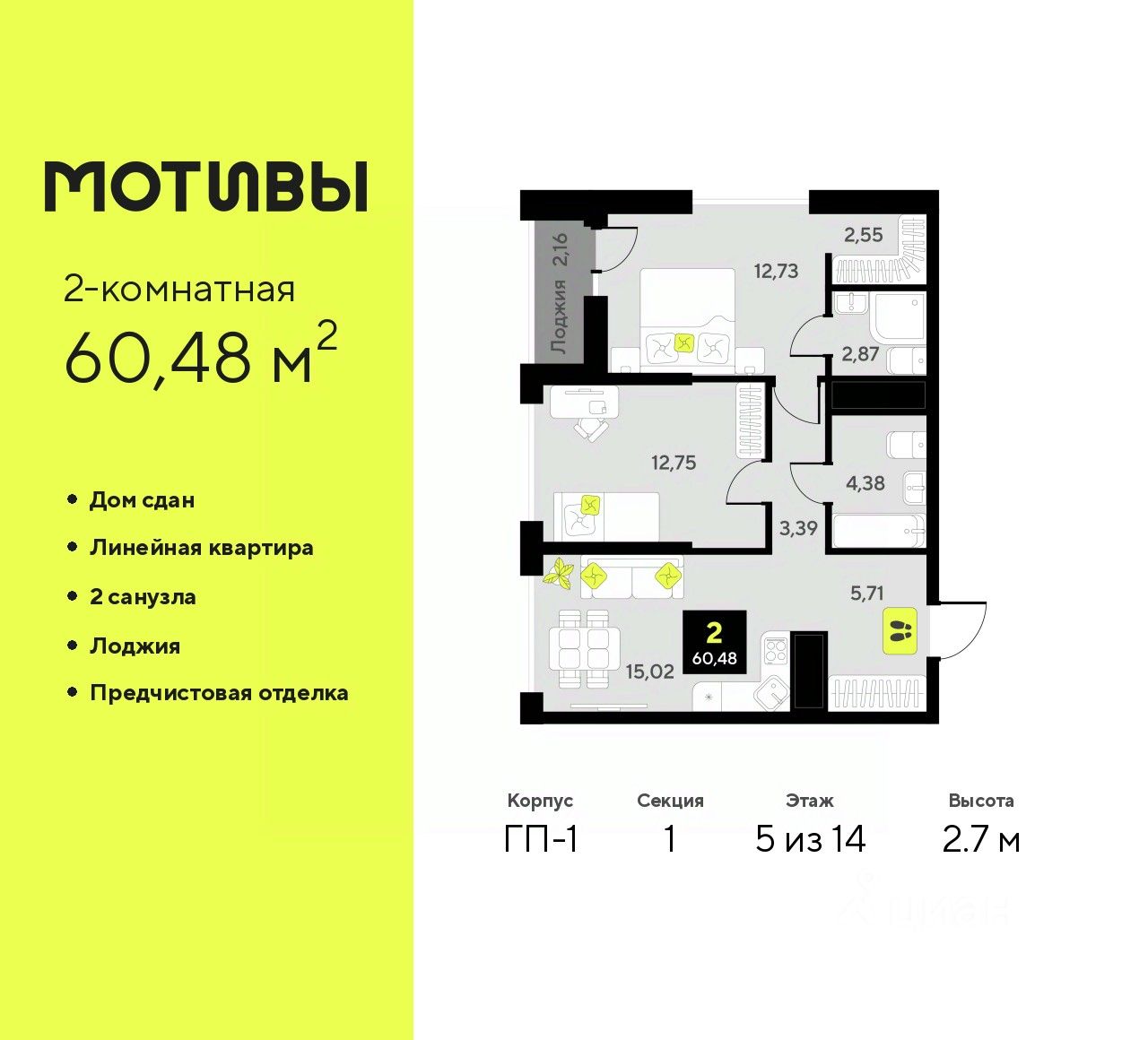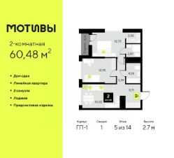 2-комн. квартира от застройщика с предчистовой отделкой в ЖК "Мотивы" на 5 этаже. Общая площадь: 60.48 кв.м., жилая: 25.48 кв.м., площадь просторной кухни-столовой: 15.02 кв.м. Комнаты изолированные, все окна выходят на одну сторону. В квартире одна лоджия, два совмещенных санузла. Высота потолков 2.7 м.