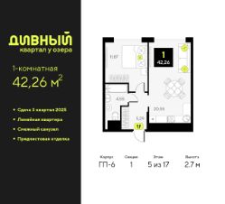 Просторная однокомнатная квартира с предчистовой отделкой в ЖК "Дивный квартал у озера" на 5 этаже. Общая площадь: 42.26 кв.м., жилая: 11.87 кв.м., площадь просторной кухни-столовой: 20.55 кв.м. Все окна выходят на одну сторону. В квартире один совмещенный санузел. Высота потолков 2.7 м.