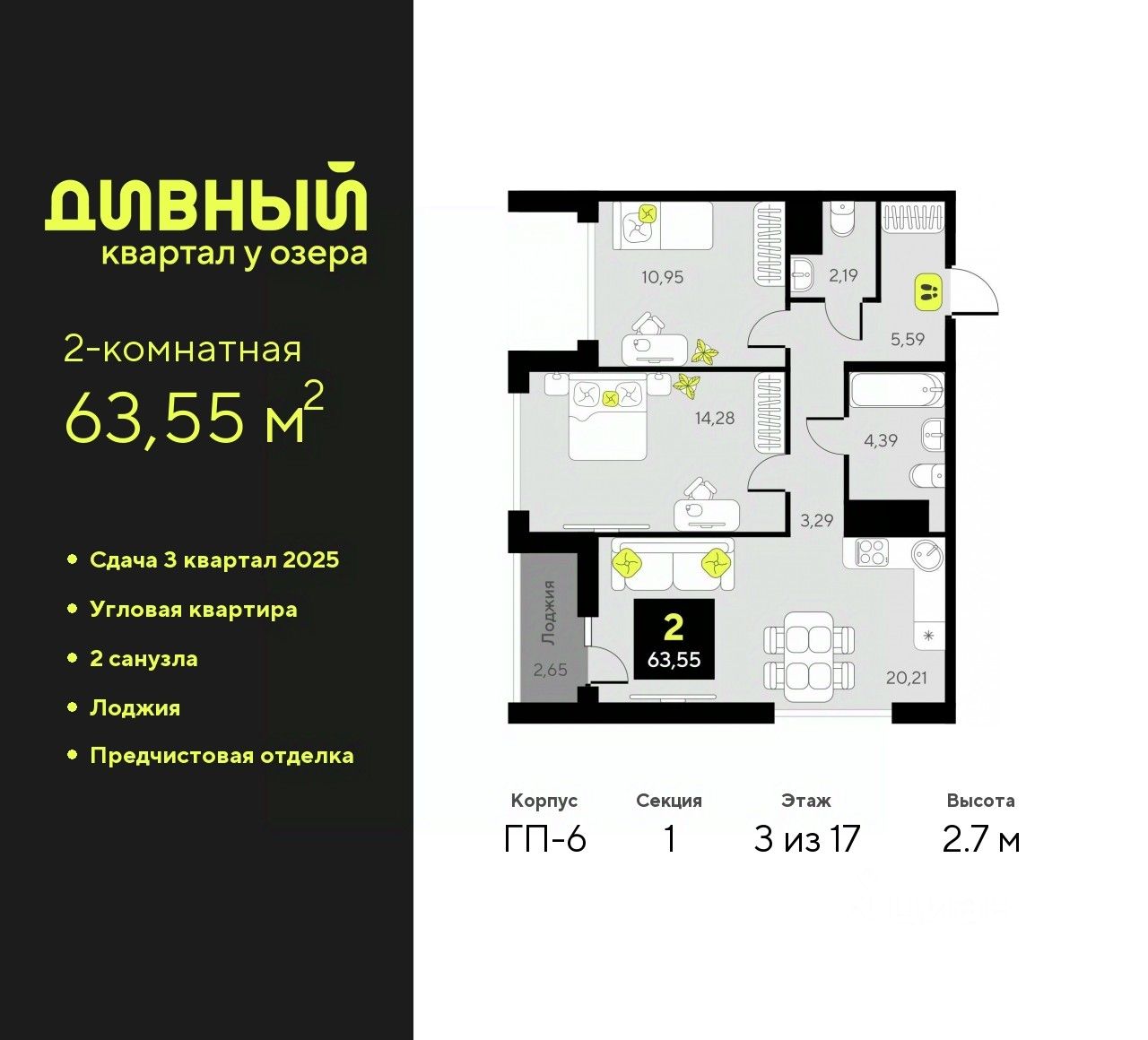 Продается двухкомнатная квартира с предчистовой отделкой в ЖК "Дивный квартал у озера" на 3 этаже. Общая площадь: 63.55 кв.м., жилая: 25.23 кв.м., площадь просторной кухни-столовой: 20.21 кв.м. Квартира угловая, окна oбecпeчивaют paвнoмepнoe ocвeщeниe в тeчeниe дня. В квартире одна лоджия, один совмещенный и один раздельный санузел. Высота потолков 2.7 м.