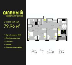 Трехкомнатная квартира от застройщика с предчистовой отделкой в ЖК "Дивный квартал у озера" на 2 этаже. Общая площадь: 79.96 кв.м., жилая: 36.12 кв.м., площадь просторной кухни-столовой: 15.49 кв.м. Комнаты изолированные, все окна выходят на одну сторону. В квартире одна лоджия, один совмещенный и один раздельный санузел. Высота потолков 2.7 м.