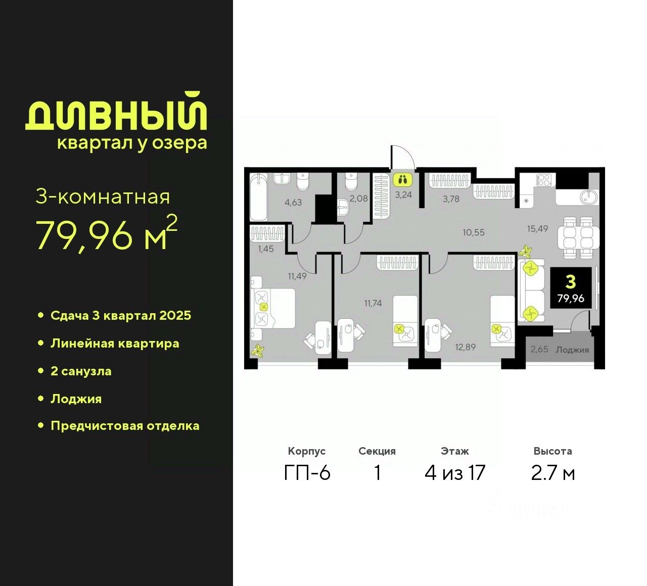 Продается трехкомнатная квартира от застройщика с предчистовой отделкой в ЖК "Дивный квартал у озера" на 4 этаже. Общая площадь: 79.96 кв.м., жилая: 36.12 кв.м., площадь просторной кухни-столовой: 15.49 кв.м. Комнаты изолированные, все окна выходят на одну сторону. В квартире одна лоджия, один совмещенный и один раздельный санузел. Высота потолков 2.7 м.