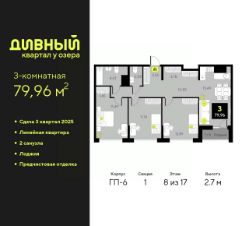 Просторная 3-комн. квартира с предчистовой отделкой в ЖК "Дивный квартал у озера" на 8 этаже. Общая площадь: 79.96 кв.м., жилая: 36.12 кв.м., площадь просторной кухни-столовой: 15.49 кв.м. Комнаты изолированные, все окна выходят на одну сторону. В квартире одна лоджия, один совмещенный и один раздельный санузел. Высота потолков 2.7 м.