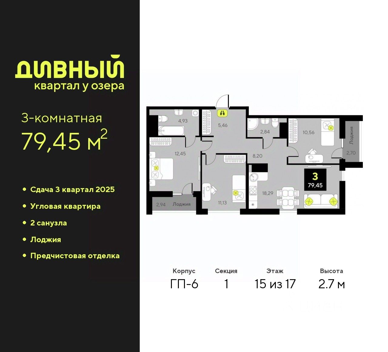 Продается 3-комн. квартира с предчистовой отделкой в ЖК "Дивный квартал у озера" на 15 этаже. Общая площадь: 79.45 кв.м., жилая: 34.14 кв.м., площадь просторной кухни-столовой: 18.29 кв.м. Угловая квартира, очень светлая, естественная вентиляция при открытии окон. В квартире две лоджии, два совмещенных санузла. Высота потолков 2.7 м.