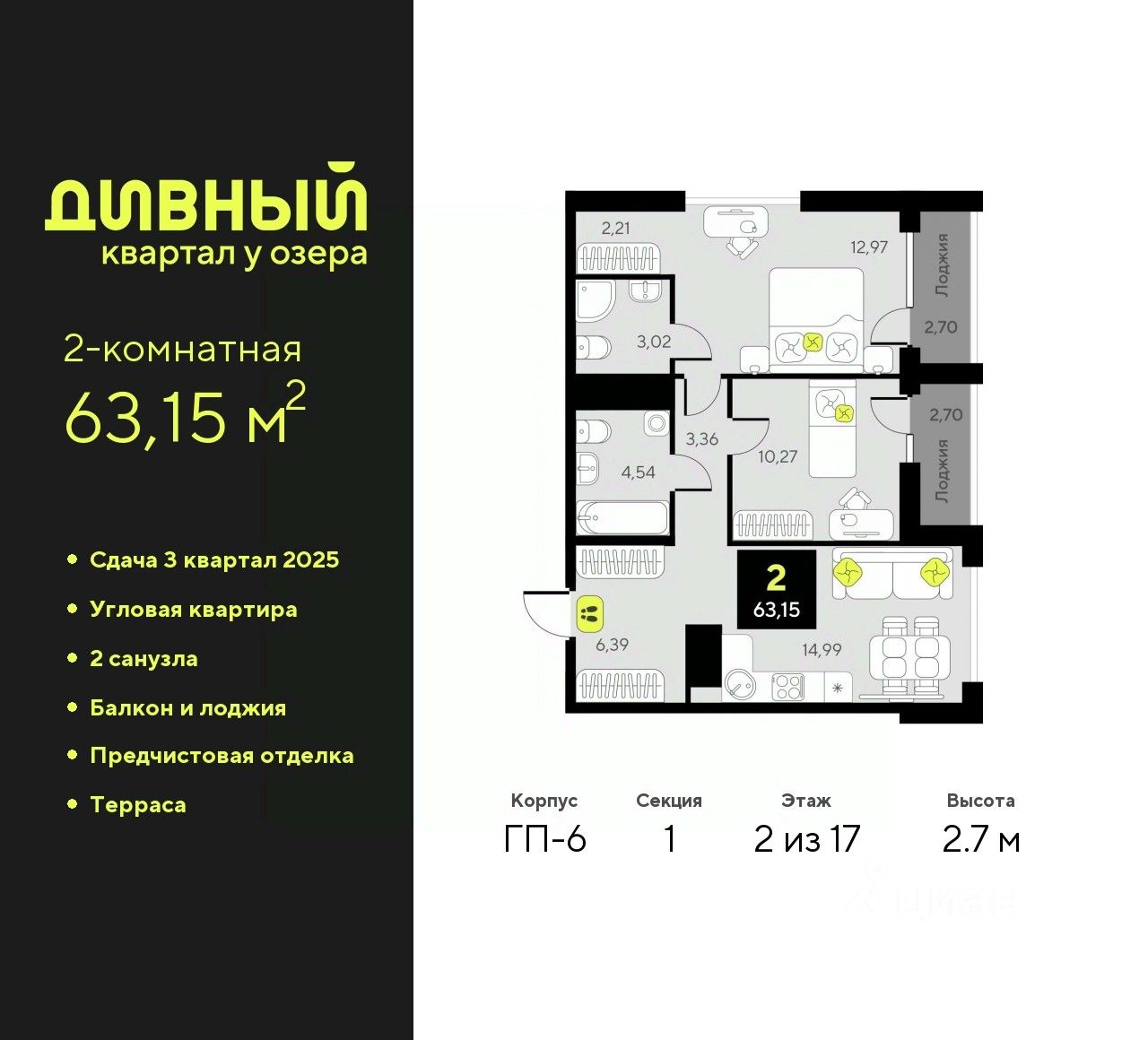 Двухкомнатная квартира с предчистовой отделкой в ЖК "Дивный квартал у озера" на 2 этаже. Общая площадь: 63.15 кв.м., жилая: 23.24 кв.м., площадь просторной кухни-столовой: 14.99 кв.м. Угловая квартира, окна oбecпeчивaют paвнoмepнoe ocвeщeниe в тeчeниe дня. В квартире один балкон и две лоджии, два совмещенных санузла. Наличие в квартире террасы дает возможность для обустройства дополнительной площади. Высота потолков 2.7 м.