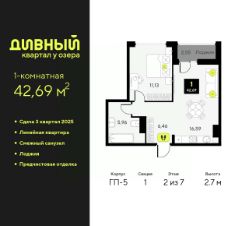 Однокомнатная квартира от застройщика с предчистовой отделкой в ЖК "Дивный квартал у озера" на 2 этаже. Общая площадь: 42.69 кв.м., жилая: 11.13 кв.м., площадь просторной кухни-столовой: 16.59 кв.м. Все окна выходят на одну сторону. В квартире одна лоджия, один совмещенный санузел. Высота потолков 2.7 м.