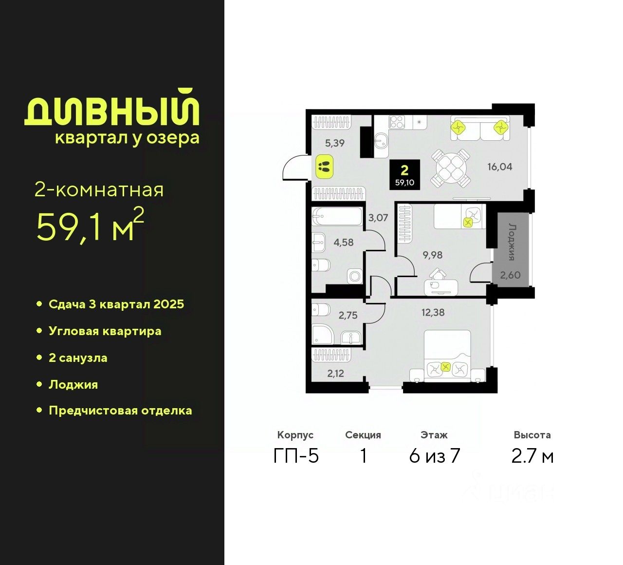 Продается 2-комн. квартира с предчистовой отделкой в ЖК "Дивный квартал у озера" на 6 этаже. Общая площадь: 59.1 кв.м., жилая: 22.36 кв.м., площадь просторной кухни-столовой: 16.04 кв.м. Квартира угловая, очень светлая, естественная вентиляция при открытии окон. В квартире одна лоджия, два совмещенных санузла. Высота потолков 2.7 м.