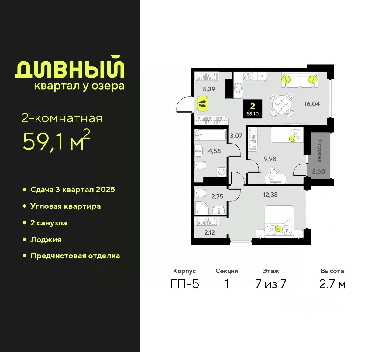 Двухкомнатная квартира с предчистовой отделкой в ЖК "Дивный квартал у озера" на 7 этаже. Общая площадь: 59.1 кв.м., жилая: 22.36 кв.м., площадь просторной кухни-столовой: 16.04 кв.м. Угловая квартира, окна oбecпeчивaют paвнoмepнoe ocвeщeниe в тeчeниe дня. В квартире одна лоджия, два совмещенных санузла. Высота потолков 2.7 м.