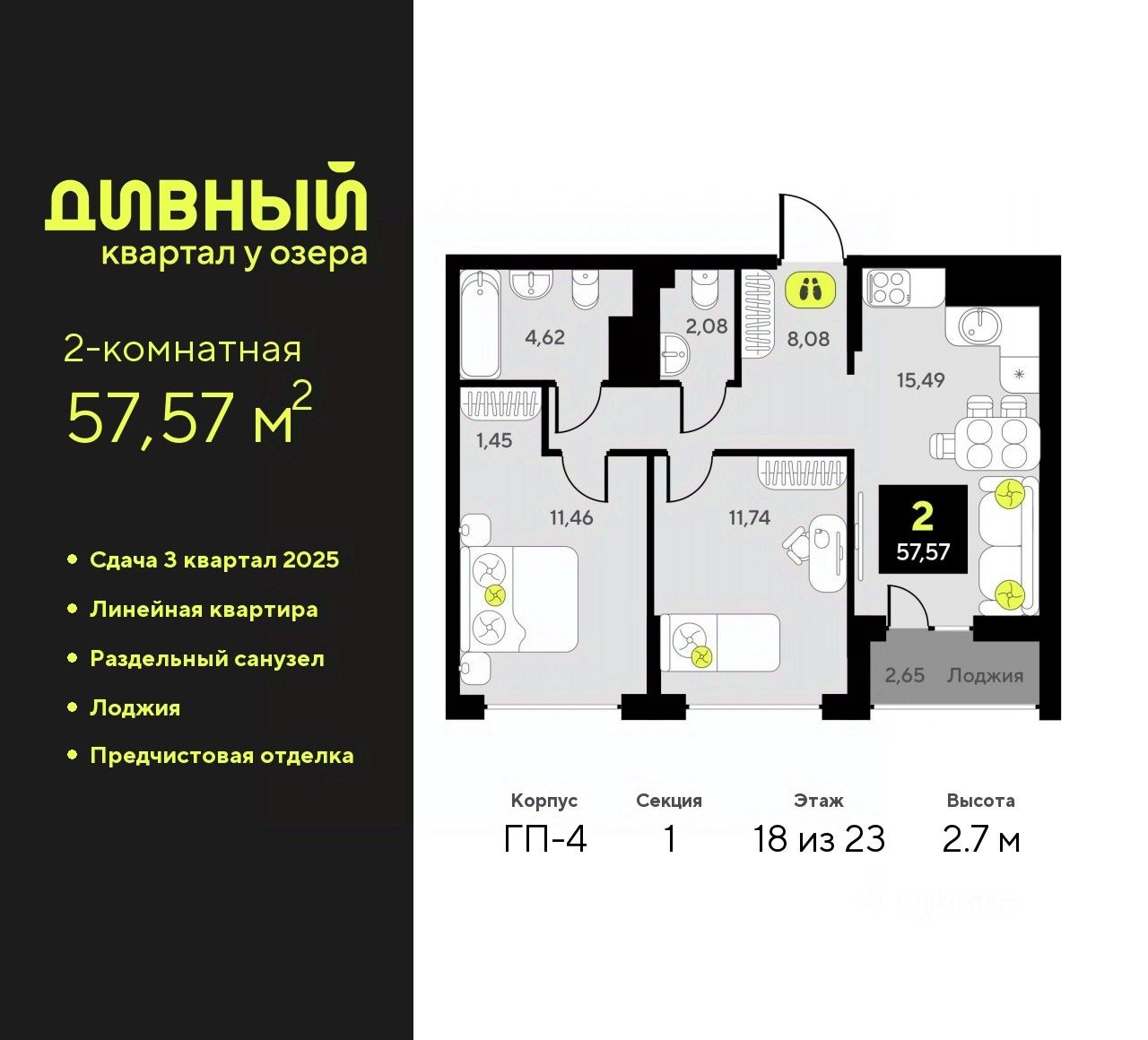Продается 2-комн. квартира с предчистовой отделкой в ЖК "Дивный квартал у озера" на 18 этаже. Общая площадь: 57.57 кв.м., жилая: 23.2 кв.м., площадь просторной кухни-столовой: 15.49 кв.м. Комнаты изолированные, все окна выходят на одну сторону. В квартире одна лоджия, один раздельный санузел. Высота потолков 2.7 м.