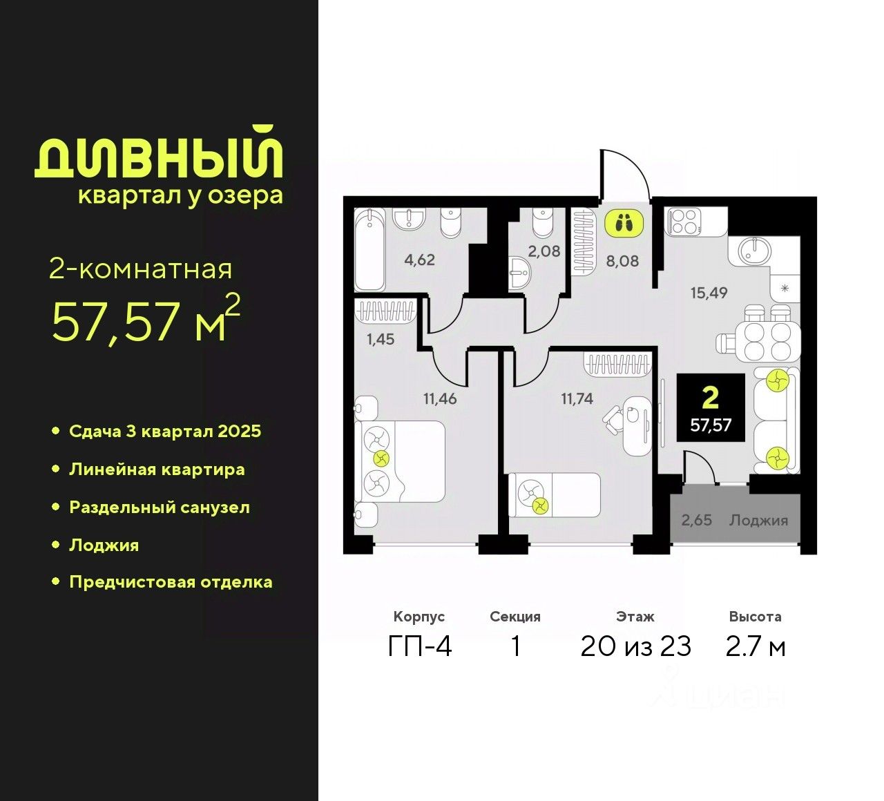 Двухкомнатная квартира с предчистовой отделкой в ЖК "Дивный квартал у озера" на 20 этаже. Общая площадь: 57.57 кв.м., жилая: 23.2 кв.м., площадь просторной кухни-столовой: 15.49 кв.м. Комнаты изолированные, все окна выходят на одну сторону. В квартире одна лоджия, один раздельный санузел. Высота потолков 2.7 м.