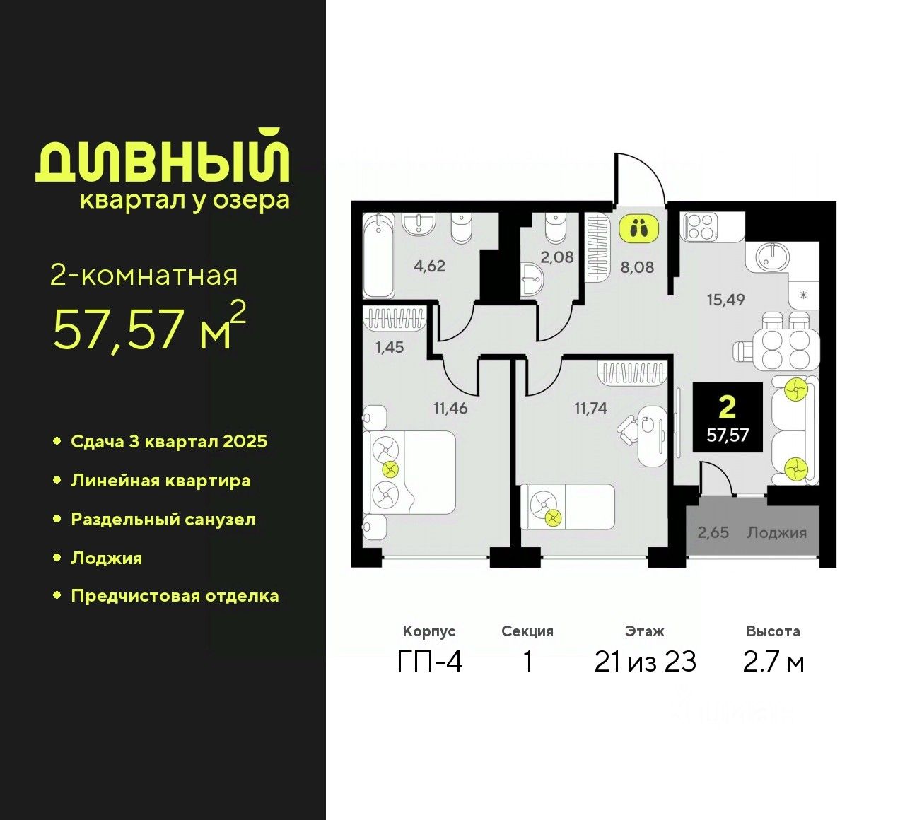 Продается 2-комн. квартира от застройщика с предчистовой отделкой в ЖК "Дивный квартал у озера" на 21 этаже. Общая площадь: 57.57 кв.м., жилая: 23.2 кв.м., площадь просторной кухни-столовой: 15.49 кв.м. Комнаты изолированные, все окна выходят на одну сторону. В квартире одна лоджия, один раздельный санузел. Высота потолков 2.7 м.