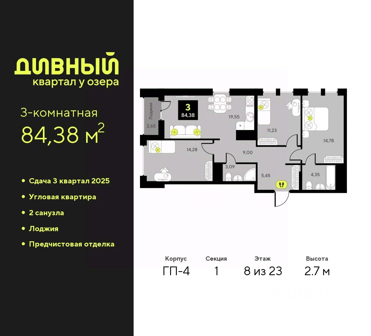 Продается 3-комн. квартира с предчистовой отделкой в ЖК "Дивный квартал у озера" на 8 этаже. Общая площадь: 84.38 кв.м., жилая: 40.29 кв.м., площадь просторной кухни-столовой: 19.55 кв.м. Квартира угловая, идеально подойдет любителям тишины и панорамных видов. В квартире одна лоджия, два совмещенных санузла. Высота потолков 2.7 м.