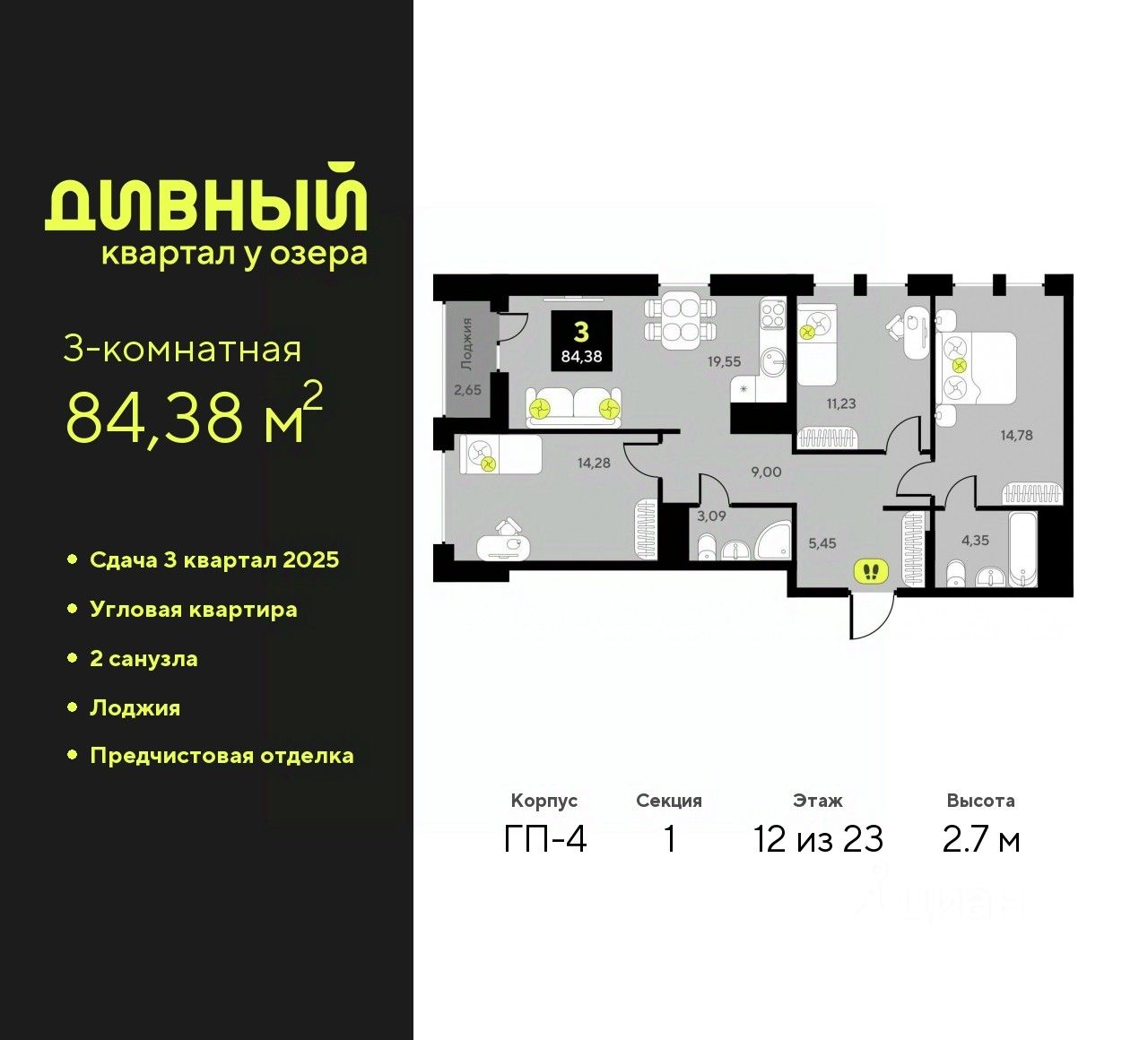 Продается 3-комн. квартира с предчистовой отделкой в ЖК "Дивный квартал у озера" на 12 этаже. Общая площадь: 84.38 кв.м., жилая: 40.29 кв.м., площадь просторной кухни-столовой: 19.55 кв.м. Угловая квартира, идеально подойдет любителям тишины и панорамных видов. В квартире одна лоджия, два совмещенных санузла. Высота потолков 2.7 м.