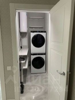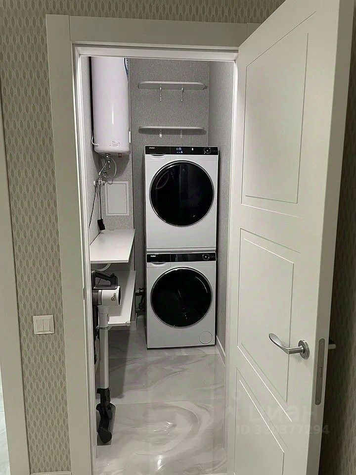 Постирочная 2м2, вмещает колонну из сушильной и стиральных машин и полок.