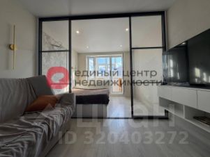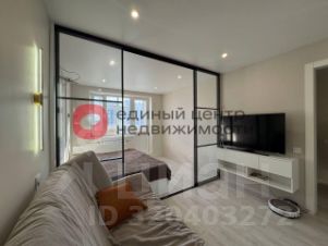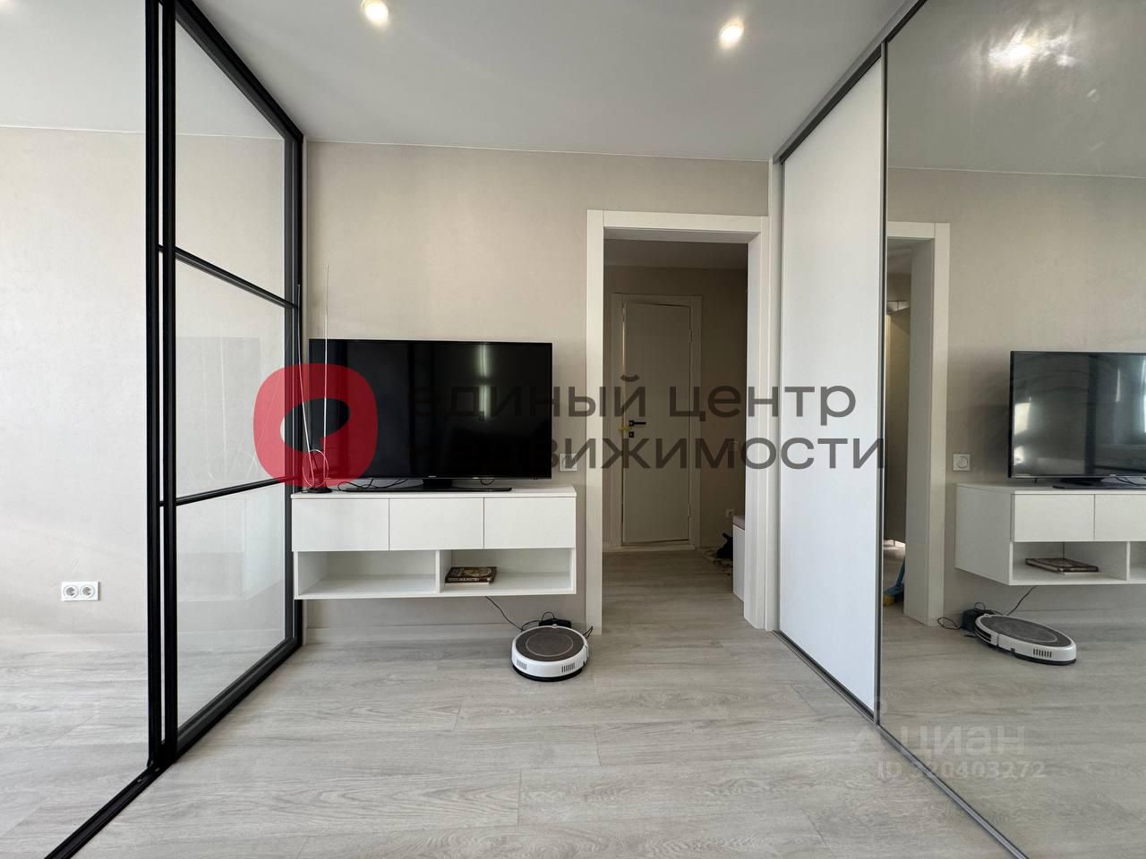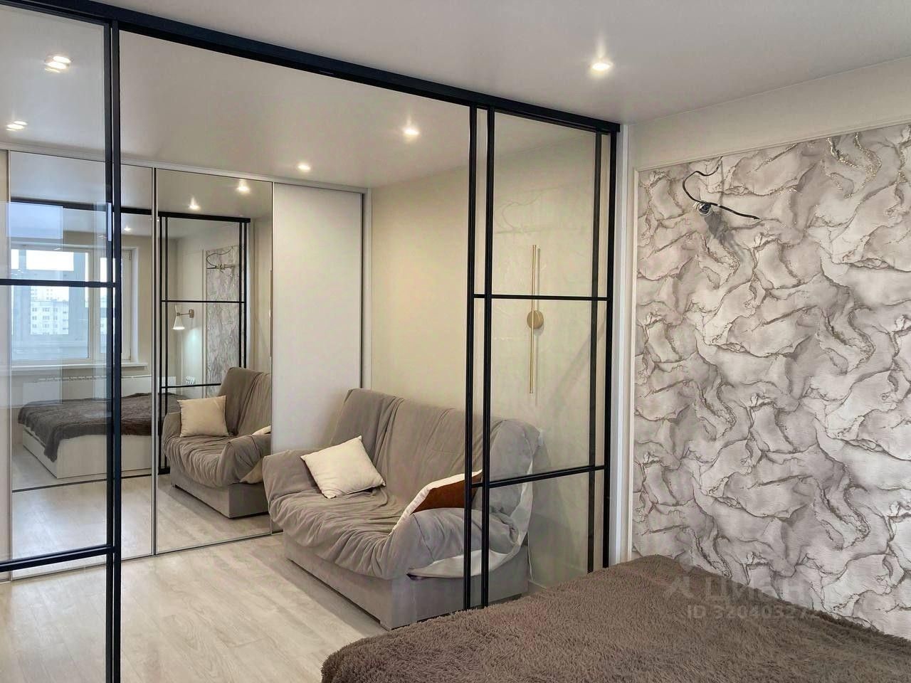 В гостинной комфортный раскладной диван с подушками и трёхсекционным шкафом-купе, подвесная тумба с телевизором.