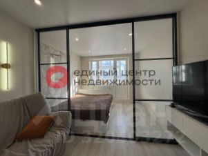 Комната 23 м2 разделена на две зоны стеклянными раздвижными дверьми, в одной спальня с кроватью 180х200 и ортопедическим матрасом.