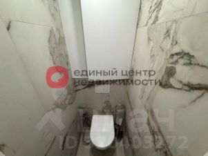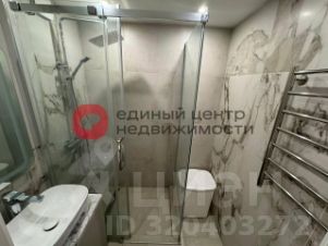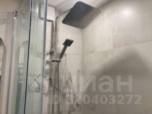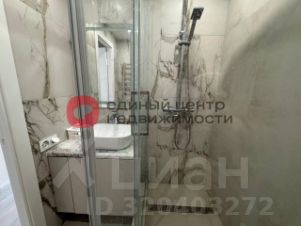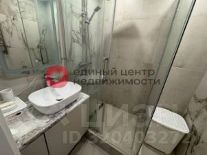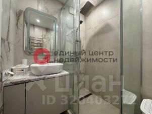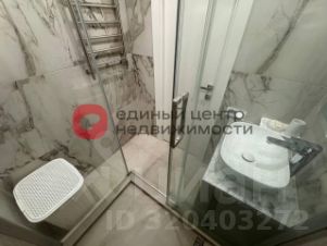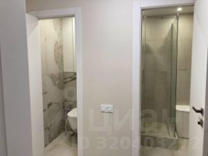 В Ванной комнате расположена душевая кабина, подвесная тумба с накладной раковиной, электрический полотенцесушитель, зеркало с подсветкой.