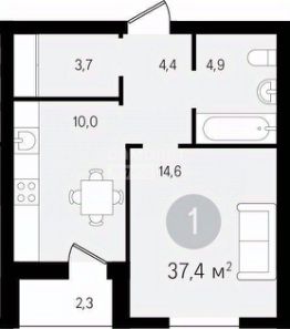 Функциональная планировка: изолированные комнаты- жилая( 14.6м2) и кухня( 10м2) ,совмещенный санузел, прихожая, лоджия. Окна с витражным остеклением, что увеличивает дополнительно освещение квартиры.