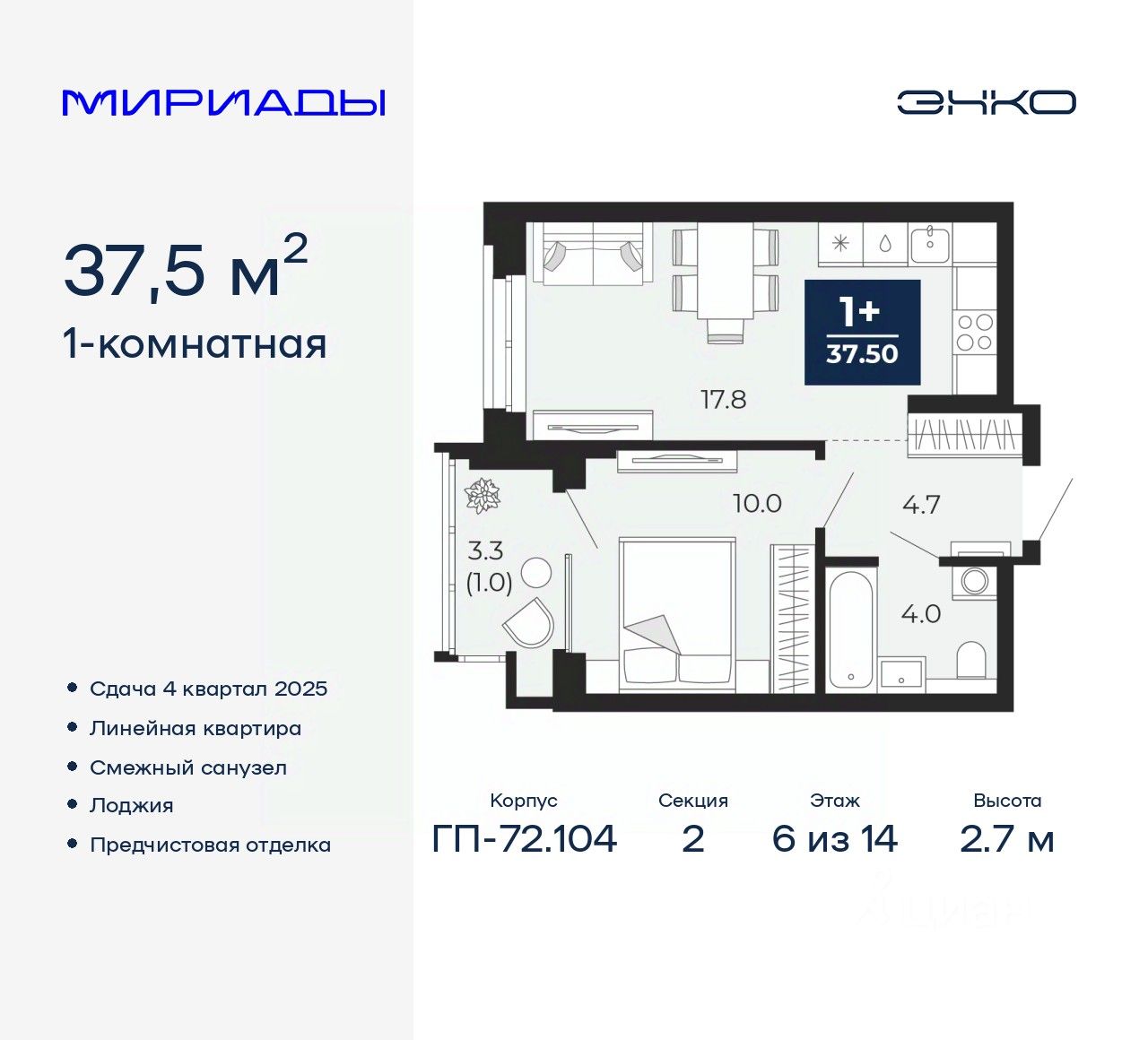 Однокомнатная квартира с предчистовой отделкой в ЖК "Мириады" на 6 этаже. Общая площадь: 37.5 кв.м., жилая: 10 кв.м., площадь просторной кухни-столовой: 17.8 кв.м. Все окна выходят на одну сторону. В квартире одна лоджия, один совмещенный санузел. Высота потолков 2.7 м.