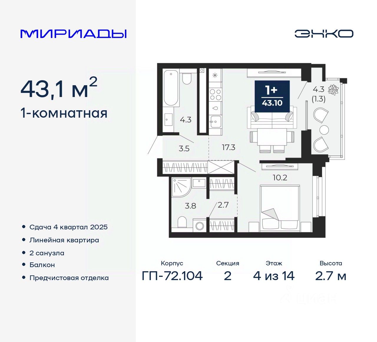 Продается однокомнатная квартира с предчистовой отделкой в ЖК "Мириады" на 4 этаже. Общая площадь: 43.1 кв.м., жилая: 10.2 кв.м., площадь просторной кухни-столовой: 17.3 кв.м. Все окна выходят на одну сторону. В квартире один балкон, два совмещенных санузла. Высота потолков 2.7 м.