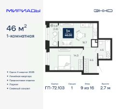 Просторная однокомнатная квартира с предчистовой отделкой в ЖК "Мириады" на 9 этаже. Общая площадь: 46 кв.м., жилая: 14.3 кв.м., площадь просторной кухни-столовой: 16.7 кв.м. Все окна выходят на одну сторону. В квартире одна лоджия, один совмещенный санузел. Высота потолков 2.7 м.