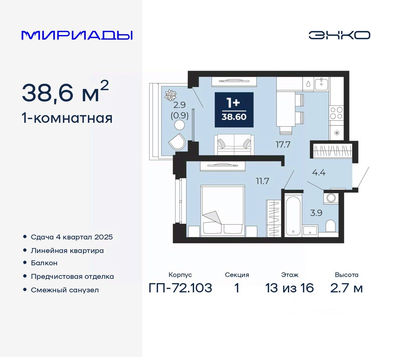 Просторная однокомнатная квартира с предчистовой отделкой в ЖК "Мириады" на 13 этаже. Общая площадь: 38.6 кв.м., жилая: 11.7 кв.м., площадь просторной кухни-столовой: 17.7 кв.м. Все окна выходят на одну сторону. В квартире один балкон, один совмещенный санузел. Высота потолков 2.7 м.