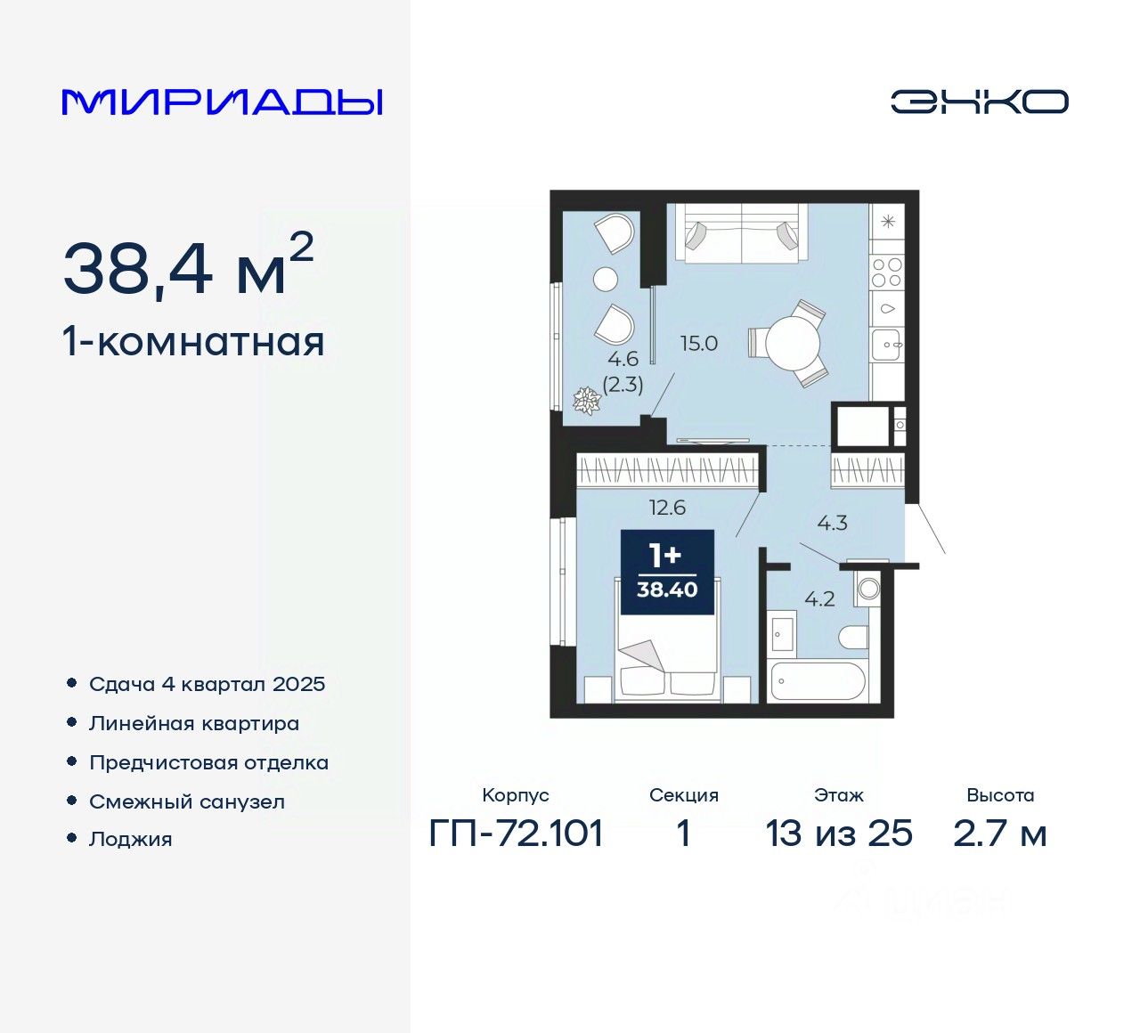1-комн. квартира от застройщика с предчистовой отделкой в ЖК "Мириады" на 13 этаже. Общая площадь: 38.4 кв.м., жилая: 12.6 кв.м., площадь просторной кухни-столовой: 15 кв.м. Все окна выходят на одну сторону. В квартире одна лоджия, один совмещенный санузел. Высота потолков 2.7 м.