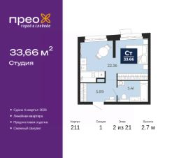 1-комн. квартира-студия от застройщика с предчистовой отделкой в ЖК "Прео" на 2 этаже. Общая площадь: 33.66 кв.м., площадь гостиной 22.36 кв.м., из которых 10 кв.м. выделено под кухонную зону. Все окна выходят на одну сторону. В квартире один совмещенный санузел. Высота потолков 2.7 м.