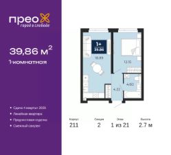Однокомнатная квартира от застройщика с предчистовой отделкой в ЖК "Прео" на 1 этаже. Общая площадь: 39.86 кв.м., жилая: 12.15 кв.м., площадь просторной кухни-столовой: 18.89 кв.м. Все окна выходят на одну сторону. В квартире один совмещенный санузел. Высота потолков 2.7 м.