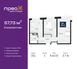 Просторная двухкомнатная квартира с предчистовой отделкой в ЖК "Прео" на 6 этаже. Общая площадь: 57.73 кв.м., жилая: 24.81 кв.м., площадь просторной кухни-столовой: 20.34 кв.м. Комнаты изолированные, все окна выходят на одну сторону. В квартире один совмещенный санузел. Высота потолков 2.7 м.