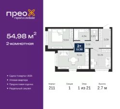 2-комн. квартира с предчистовой отделкой в ЖК "Прео" на 1 этаже. Общая площадь: 54.98 кв.м., жилая: 22.83 кв.м., площадь просторной кухни-столовой: 15.24 кв.м. Угловая квартира, идеально подойдет любителям тишины и панорамных видов. В квартире один раздельный санузел. Высота потолков 2.7 м.