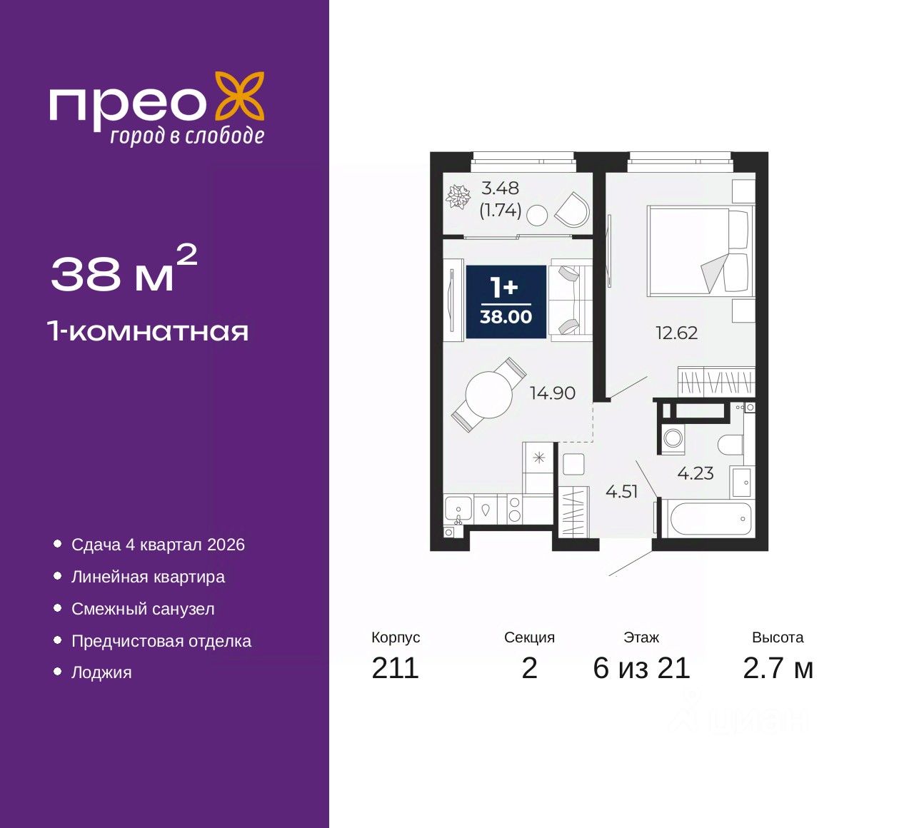Однокомнатная квартира от застройщика с предчистовой отделкой в ЖК "Прео" на 6 этаже. Общая площадь: 38 кв.м., жилая: 12.62 кв.м., площадь просторной кухни-столовой: 14.9 кв.м. Все окна выходят на одну сторону. В квартире одна лоджия, один совмещенный санузел. Высота потолков 2.7 м.