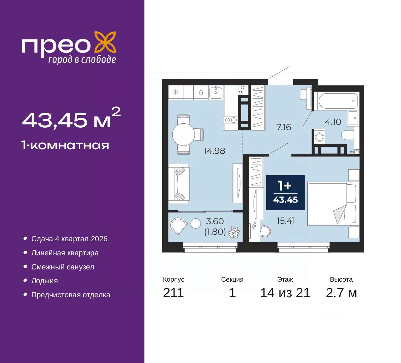 Однокомнатная квартира от застройщика с предчистовой отделкой в ЖК "Прео" на 14 этаже. Общая площадь: 43.45 кв.м., жилая: 15.41 кв.м., площадь просторной кухни-столовой: 14.98 кв.м. Все окна выходят на одну сторону. В квартире одна лоджия, один совмещенный санузел. Высота потолков 2.7 м.