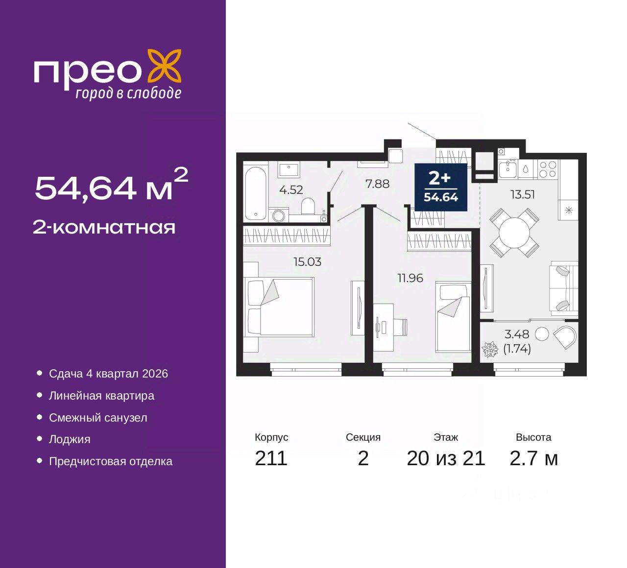 Просторная 2-комн. квартира с предчистовой отделкой в ЖК "Прео" на 20 этаже. Общая площадь: 54.64 кв.м., жилая: 26.99 кв.м., площадь просторной кухни-столовой: 13.51 кв.м. Комнаты изолированные, все окна выходят на одну сторону. В квартире одна лоджия, один совмещенный санузел. Высота потолков 2.7 м.