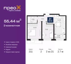 Продается двухкомнатная квартира от застройщика с предчистовой отделкой в ЖК "Прео" на 2 этаже. Общая площадь: 55.44 кв.м., жилая: 26.99 кв.м., площадь просторной кухни-столовой: 14.05 кв.м. Комнаты изолированные, все окна выходят на одну сторону. В квартире одна лоджия, один совмещенный санузел. Высота потолков 2.7 м.