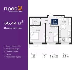 Просторная 2-комн. квартира с предчистовой отделкой в ЖК "Прео" на 2 этаже. Общая площадь: 55.44 кв.м., жилая: 26.99 кв.м., площадь просторной кухни-столовой: 14.05 кв.м. Комнаты изолированные, все окна выходят на одну сторону. В квартире одна лоджия, один совмещенный санузел. Высота потолков 2.7 м.