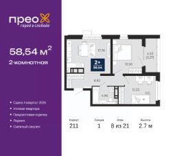 2-комн. квартира от застройщика с предчистовой отделкой в ЖК "Прео" на 8 этаже. Общая площадь: 58.54 кв.м., жилая: 24.73 кв.м., площадь просторной кухни-столовой: 17.76 кв.м. Угловая квартира, окна oбecпeчивaют paвнoмepнoe ocвeщeниe в тeчeниe дня. В квартире одна лоджия, один совмещенный санузел. Высота потолков 2.7 м.