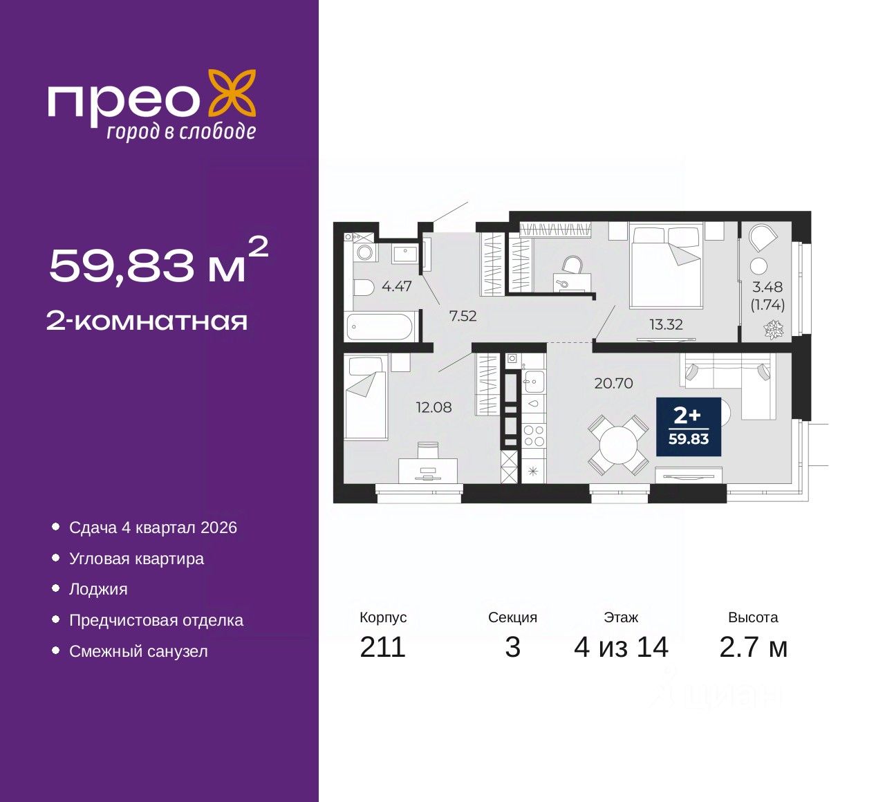 Просторная двухкомнатная квартира с предчистовой отделкой в ЖК "Прео" на 4 этаже. Общая площадь: 59.83 кв.м., жилая: 25.4 кв.м., площадь просторной кухни-столовой: 20.7 кв.м. Угловая квартира, идеально подойдет любителям тишины и панорамных видов. В квартире одна лоджия, один совмещенный санузел. Высота потолков 2.7 м.