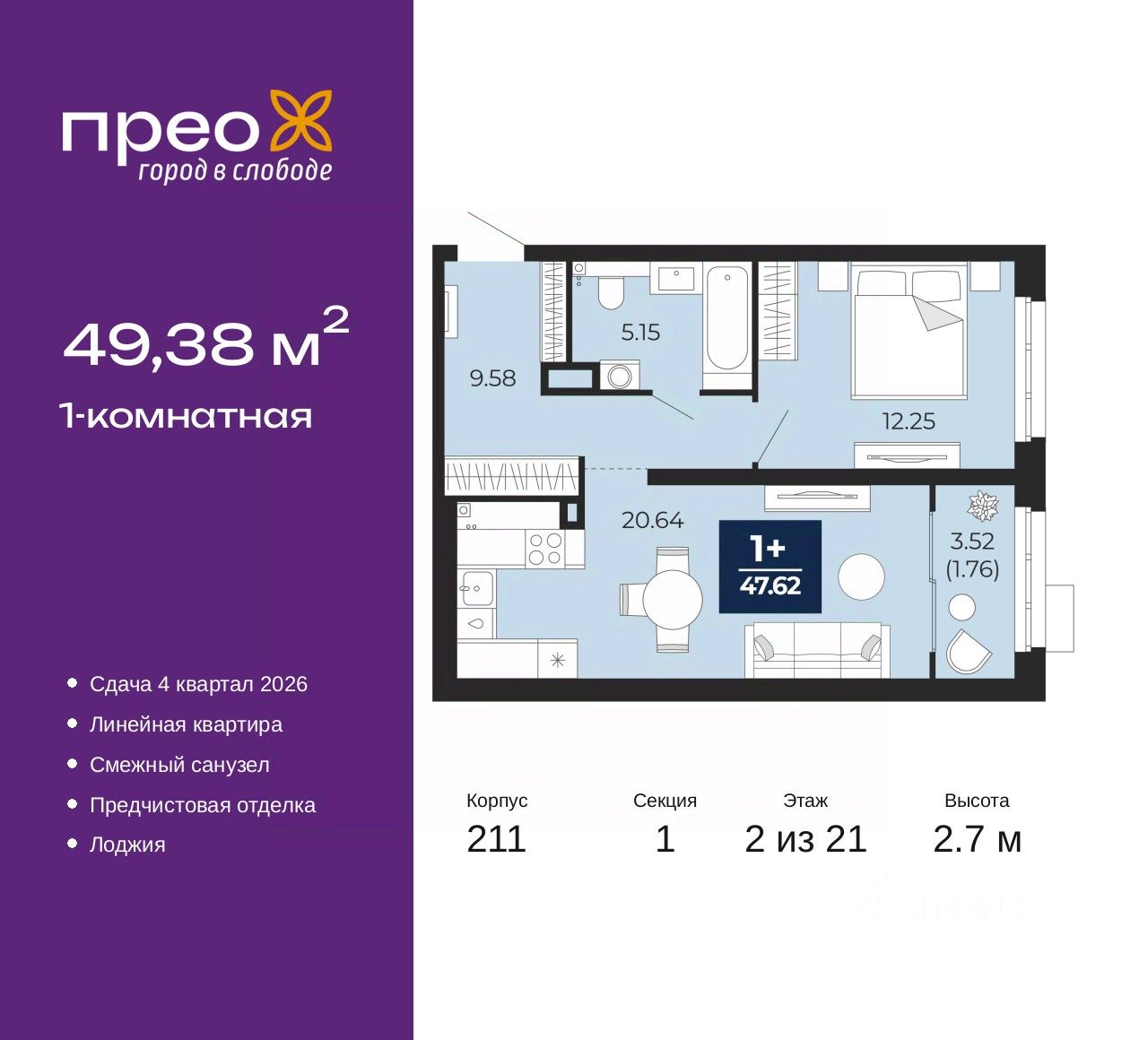 Однокомнатная квартира с предчистовой отделкой в ЖК "Прео" на 2 этаже. Общая площадь: 49.38 кв.м., жилая: 12.25 кв.м., площадь просторной кухни-столовой: 20.64 кв.м. Все окна выходят на одну сторону. В квартире одна лоджия, один совмещенный санузел. Высота потолков 2.7 м.