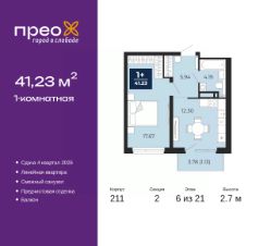1-комн. квартира с предчистовой отделкой в ЖК "Прео" на 6 этаже. Общая площадь: 41.23 кв.м., жилая: 17.67 кв.м., площадь просторной кухни-столовой: 12.3 кв.м. Все окна выходят на одну сторону. В квартире один балкон, один совмещенный санузел. Высота потолков 2.7 м.