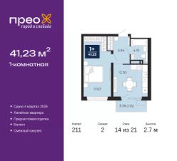 1-комн. квартира от застройщика с предчистовой отделкой в ЖК "Прео" на 14 этаже. Общая площадь: 41.23 кв.м., жилая: 17.67 кв.м., площадь просторной кухни-столовой: 12.3 кв.м. Все окна выходят на одну сторону. В квартире один балкон, один совмещенный санузел. Высота потолков 2.7 м.
