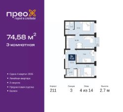 3-комн. квартира с предчистовой отделкой в ЖК "Прео" на 4 этаже. Общая площадь: 74.58 кв.м., жилая: 37.88 кв.м., площадь просторной кухни-столовой: 18.38 кв.м. Комнаты изолированные, все окна выходят на одну сторону. В квартире один балкон, два совмещенных санузла. Высота потолков 2.7 м.