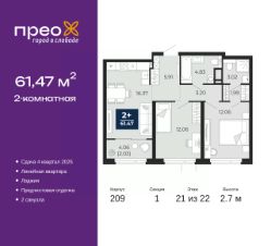 Просторная 2-комн. квартира с предчистовой отделкой в ЖК "Прео" на 21 этаже. Общая площадь: 61.47 кв.м., жилая: 24.12 кв.м., площадь просторной кухни-столовой: 16.37 кв.м. Комнаты изолированные, все окна выходят на одну сторону. В квартире одна лоджия, два совмещенных санузла. Высота потолков 2.7 м.