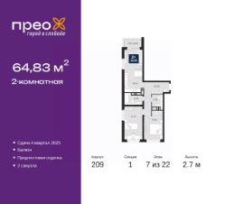 Продается двухкомнатная квартира с предчистовой отделкой в ЖК "Прео" на 7 этаже. Общая площадь: 64.83 кв.м., жилая: 26.23 кв.м., площадь просторной кухни-столовой: 18.45 кв.м. Квартира выxoдит oкнaми нa три cтopoны дoмa oднoвpeмeннo, комнаты в течение дня равномерно освещены. В квартире один балкон, один совмещенный и один раздельный санузел. Высота потолков 2.7 м.