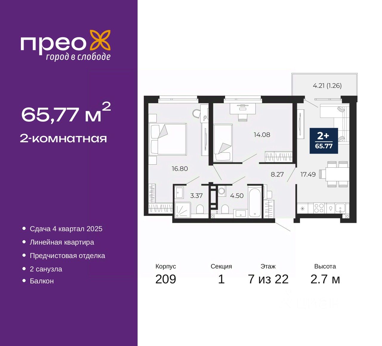Двухкомнатная квартира с предчистовой отделкой в ЖК "Прео" на 7 этаже. Общая площадь: 65.77 кв.м., жилая: 30.88 кв.м., площадь просторной кухни-столовой: 17.49 кв.м. Комнаты изолированные, все окна выходят на одну сторону. В квартире один балкон, два совмещенных санузла. Высота потолков 2.7 м.