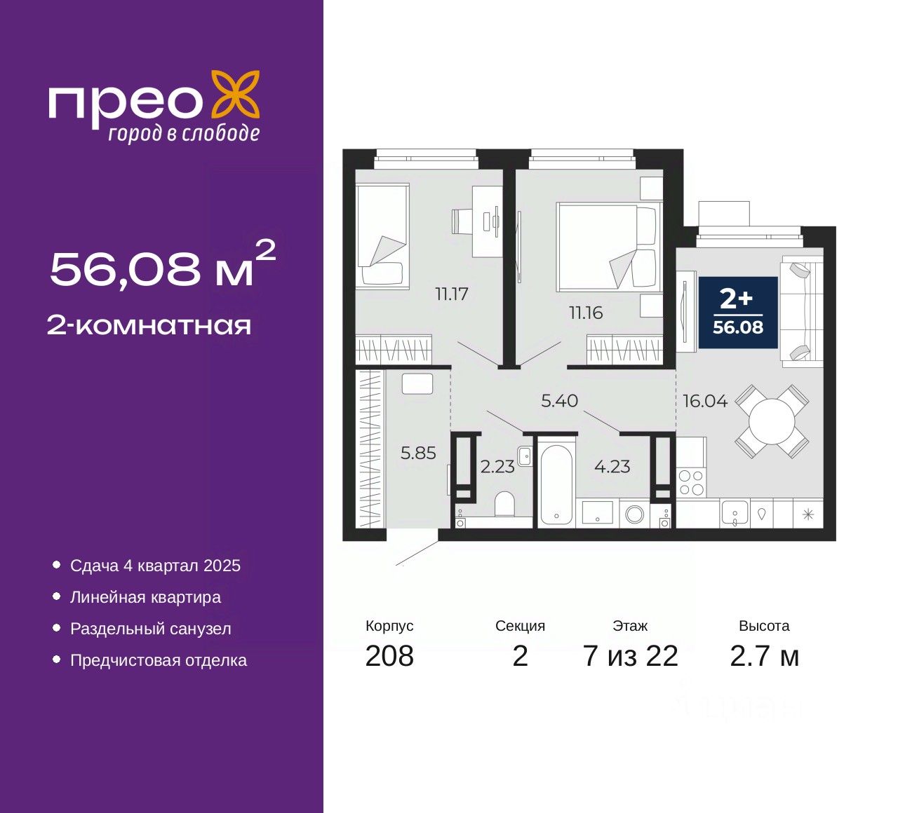 Двухкомнатная квартира с предчистовой отделкой в ЖК "Прео" на 7 этаже. Общая площадь: 56.08 кв.м., жилая: 22.33 кв.м., площадь просторной кухни-столовой: 16.04 кв.м. Комнаты изолированные, все окна выходят на одну сторону. В квартире один раздельный санузел. Высота потолков 2.7 м.