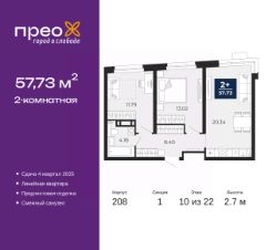 Двухкомнатная квартира с предчистовой отделкой в ЖК "Прео" на 10 этаже. Общая площадь: 57.73 кв.м., жилая: 24.81 кв.м., площадь просторной кухни-столовой: 20.34 кв.м. Комнаты изолированные, все окна выходят на одну сторону. В квартире один совмещенный санузел. Высота потолков 2.7 м.