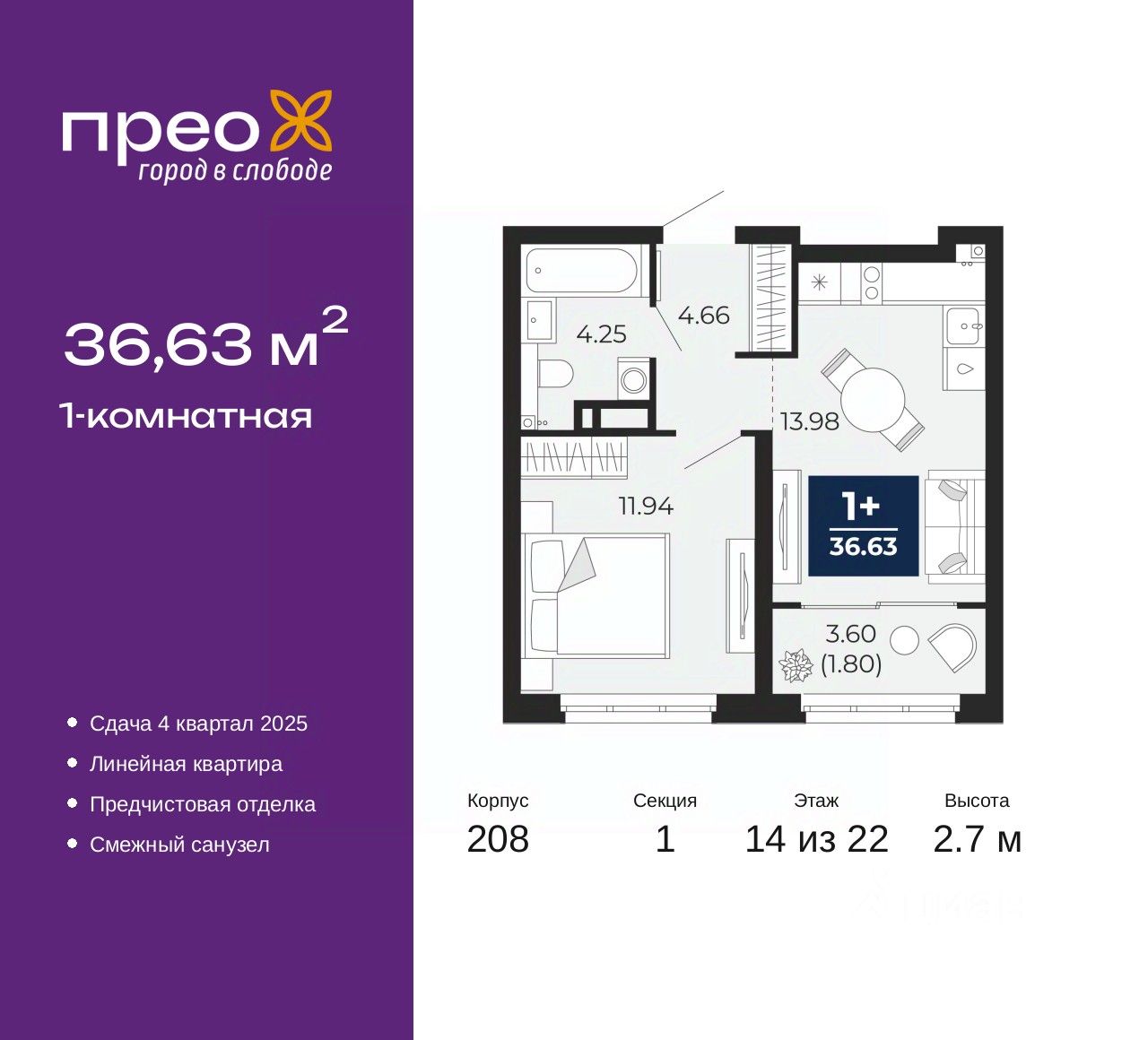 Просторная 1-комн. квартира с предчистовой отделкой в ЖК "Прео" на 14 этаже. Общая площадь: 36.63 кв.м., жилая: 11.94 кв.м., площадь просторной кухни-столовой: 13.98 кв.м. Все окна выходят на одну сторону. В квартире один совмещенный санузел. Высота потолков 2.7 м.